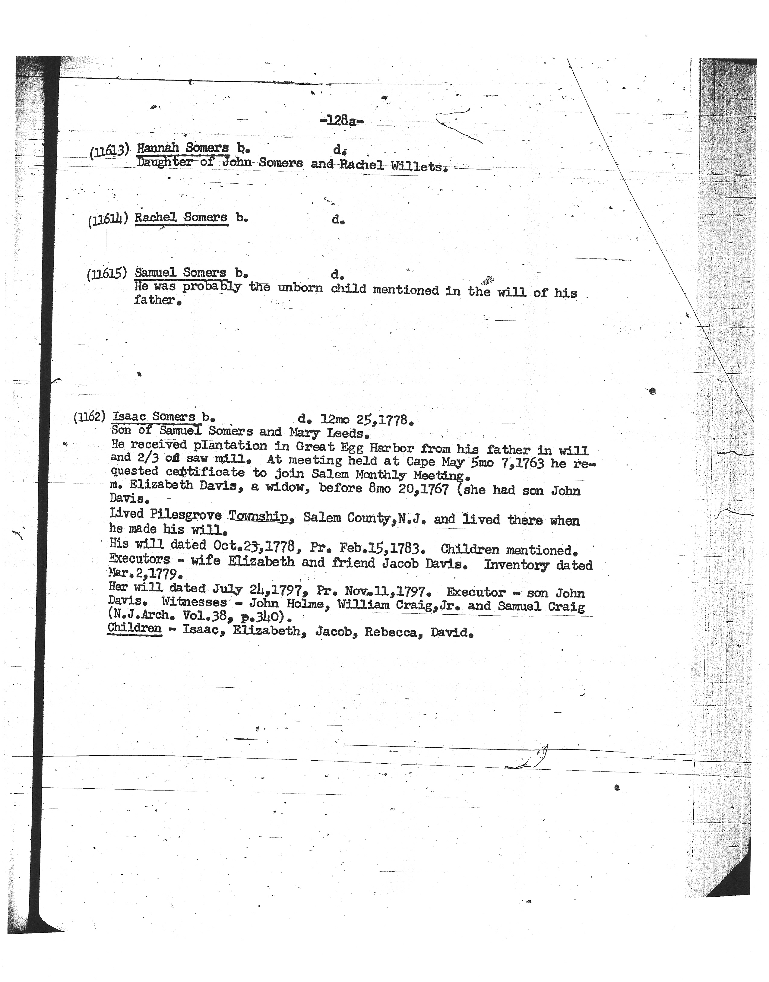 14 Elizabeth Somers was an executor in the distribution of the estate of Isaac Somers. after 25 December 1778 in Salem County, New Jersey.
